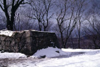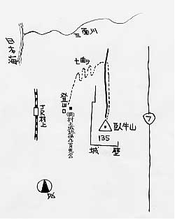 登り口は、村上市内の住宅地で、広い登山道がついていて、つづらおりの「七曲り」の坂を登れば30分たらずで南端の三角点につくことができる。西は、市街地を俯瞰(ふかん)し、そのむこうに三面川(みおもてがわ)河口、粟島、日本海。東には朝日連峰や遠く飯豊の山々をのぞむかとができる。スーツ姿でもなんとか登れる。 四十数年前、私がまだ独り者の頃、ここを登山のトレーニング場にした。東西南北からよじ登りヤブコギの練習をした。真冬には、腰まで雪につかり、正面からいどんだ。そして、まだナイロンザイルではなく、マニラ麻の登山ロープの時代にこれを使って石垣を登り降りしてロッククライミングの道場にもした。人は何故山に登るのか、などというアルピニスト論にもひたりながら。 現在は、積雪期でも毎日市民が登っていて足跡は絶えない。故人になられたが片岡角太郎さんが主宰された「しおでの会」の人たちは、年中毎朝登りつづけて三十年にもなる。 |